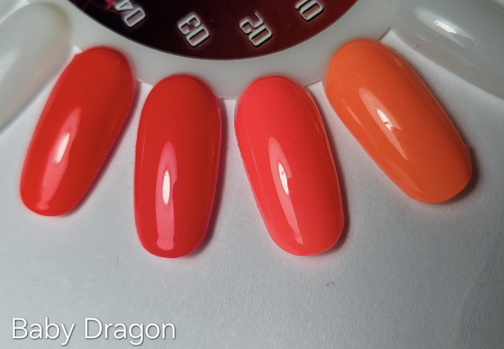 A Baby Dragon gél lakk egy közepesen pigmentált, 3 lépéses, közepesen sűrű állagú gél lakk, amely két rétegben tökéletes fedést biztosít. A kollekció négy vibráló árnyalatot tartalmaz: a neon babarózsaszíntől egészen a tüzes pirosig. Ezek a színek nemcsak nyáron, de UV-fény alatt is feltűnően világítanak – tökéletesek, ha igazán látványos manikűrre vágysz!