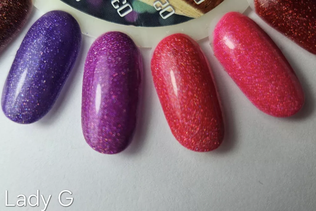 Az Lady G gél lakk egy közepesen pigmentált, 3 lépéses és közepesen sűrű gél lakk, két rétegben  fed amely nagyfokú kopásállósággal rendelkezik. Használatával a csillámos körmök kedvelőnek szerzel örömet.